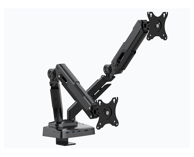 本产品为显示器支臂与三显通用扩展坞的全新组合,限制器支架部分兼容VESA VESA 75x75/100x100mm 的全动态多显示器装置支架,支持 2 个显示器,每臂最大支持35英寸显示器。支架上有一个可拆卸的VESA板,让装置显示器变得更容易。底座可使用C型夹通过旋紧螺丝牢靠在桌面上。两个支持臂都内置启转动簧,可以轻松将极重的显示屏移动到恣意位置,上下两轴都支持水平偏向360°旋转,提高了人体工程学的恬静度和生产力。该产品集视频,音频,数据,网络,充电全功效于一身,兼容所有装备,可知足任何用户的所有需求,是办公/商用/家用的完善选择。(请选用130W以上的DC电源适配器)